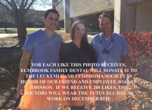 As many of you may know, our beloved hygienist of 10 years, Joanne passed away in October from AML Leukemia, a form of blood cancer. Her battle with this cancer has touched us and we miss her deeply. Through all of her journey, she maintained a positive and uplifting attitude, reassuring the people around her that things would be fine because she would be “going to a better place.” During a time that it is so easy to mourn the loss of someone we love, we are choosing to come together and celebrate the blessings of her life instead. Through this celebration, we have decided to host a fund raiser for the Leukemia and Lymphoma Society (LLS) in her honor.